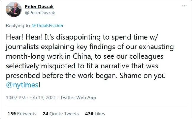 Britský zoolog Peter Saszak, který se mise Světové zdravotnické organizace účastní, roztrpčeně tvrdí, že ty povídačky o tom, jak jim Čína odmítla poskytnout data, jsou nesmysl.