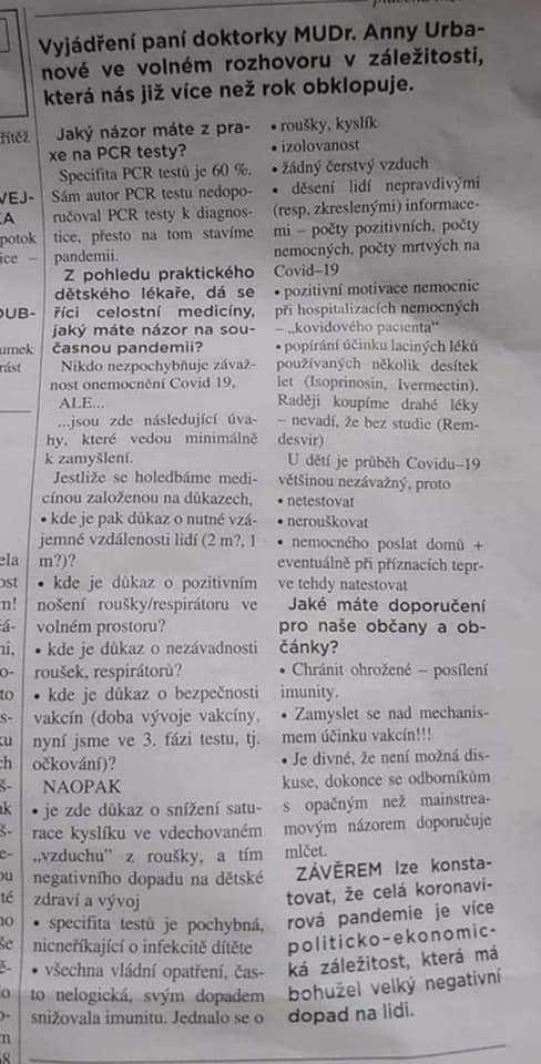 Názor dětské lékařky s 35letou praxí v přeštických novinách, která uvedla, že celá koronavirová pandemie je více politicko-ekonomická záležitost, která má bohužel velký negativní dopad na lidi. (Foto: Přeštické noviny)Více v článku níže: