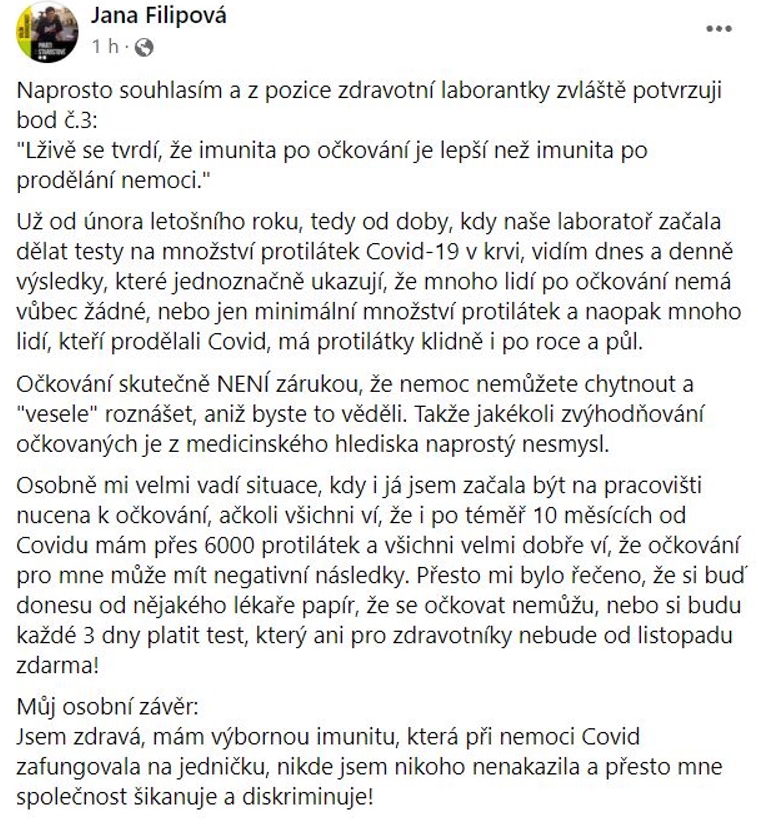 Podle zkušeností laborantky Jany Filipové skutečně prodělání covidu-19 vítězí nad očkováním v tvorbě protilátek. (Foto: Youtube / Reflex)„Vidím dnes a denně výsledky, které jednoznačně ukazují, že mnoho lidí po očkování nemá vůbec žádné, nebo jen minimální množství protilátek a naopak mnoho lidí, kteří prodělali covid, má protilátky klidně i po roce a půl,“ říká. Zvýhodňování …