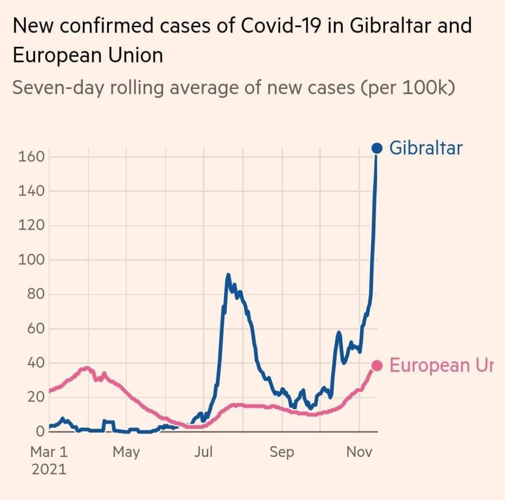 Na Gibraltaru, malém britském zámořském území, které má společnou pozemní hranici se Španělskem, bylo v posledních sedmi dnech zaznamenáno v průměru 56 případů onemocnění virem covid-19 denně, přičemž v září to bylo méně než 10 případů denně. Nárůst případů, který vláda označila za „exponenciální,“ přichází navzdory tomu, že Gibraltar má nejvyšší míru proočkovanosti na světě.