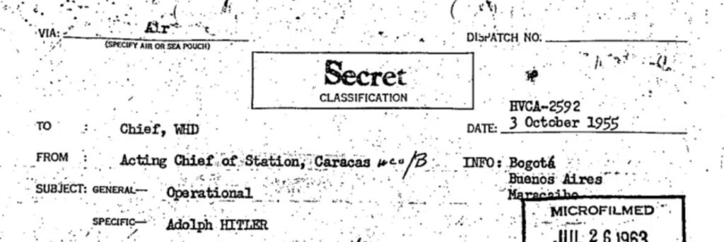 Tyto odtajněné spisy obsahují fotografii, na které je podle informátora CIA Hitler v Kolumbii v roce 1955.