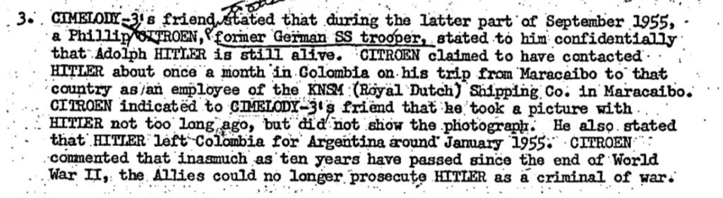 Hitler měl žít v roce 1955 pod jménem Schüttermayer v Kolumbii v komunitě bývalých nacistů. Do rukou agentury se dokonce dostala fotografie, na které měl být zachycen právě Adolf Hitler.
