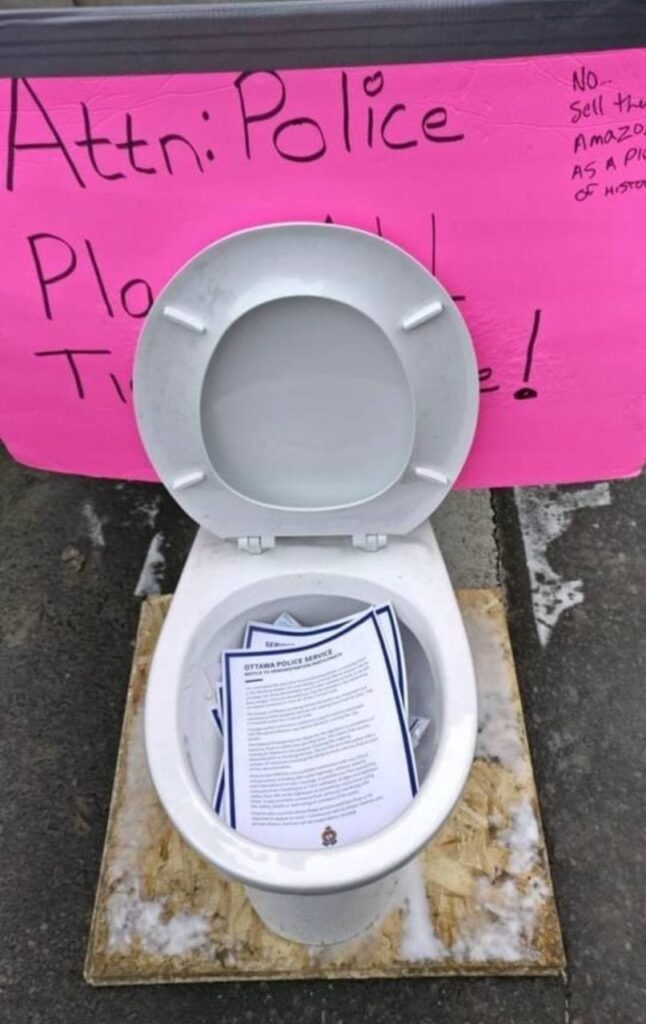 Ottawská policie chodí od kamionu ke kamionu a rozdává protestujícím z Konvoje svobody letáky, které požadují okamžité opuštění demonstrační zóny, jinak jim hrozí zatčení a obvinění z trestného činu. (Foto: Twitter)Jaká byla reakce řidičů kamionů? Někteří kamioňáci zřídili recyklační záchod:Další jej vrátil přímo policistovi:Jiný řidič uvedl, že má daleko více dopisů od dětí a lidí, …
