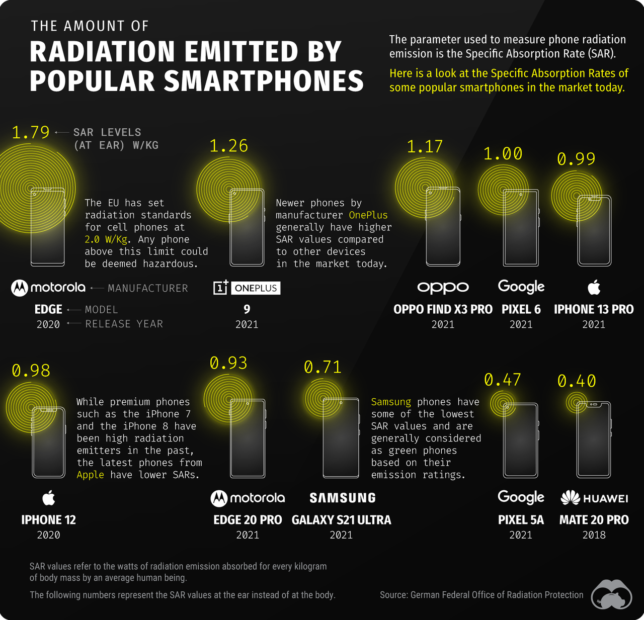 Většina lidí stráví na svých telefonech 5 až 6 hodin denně. A jak níže podrobně popisují Anshool Deshmukh a Sabrina Lam z Visual Capitalist, vzhledem k tomu, že naše telefony vyzařují nepatrné množství záření, vystavujeme se záření po celé hodiny každý den.