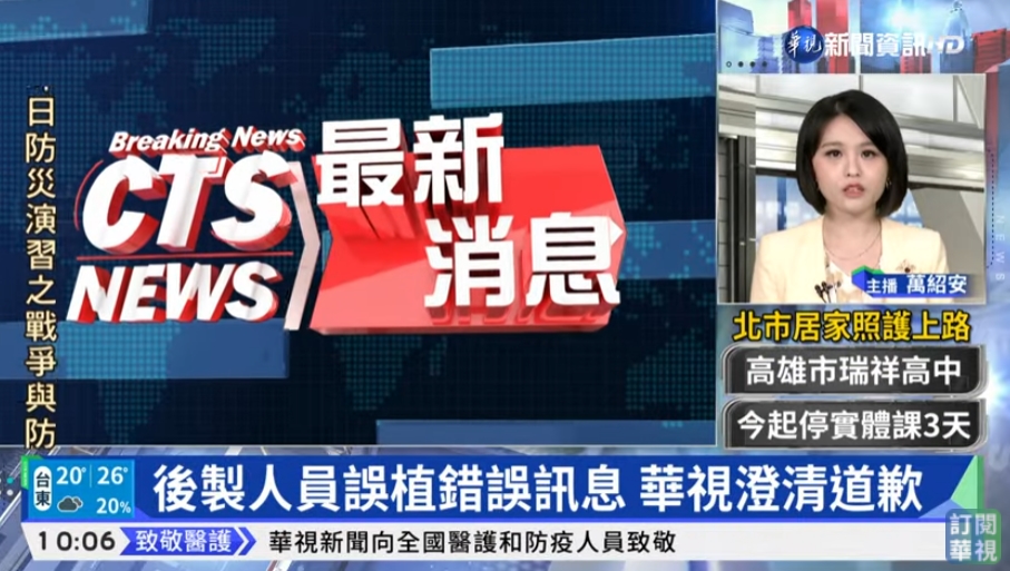 CTS přičítá chybu zaměstnancům, kteří omylem vypustili obsah z cvičení na prevenci katastrof, které byla stanice pověřena vypracovat pro hasičský sbor města Nová Tchaj-pej.