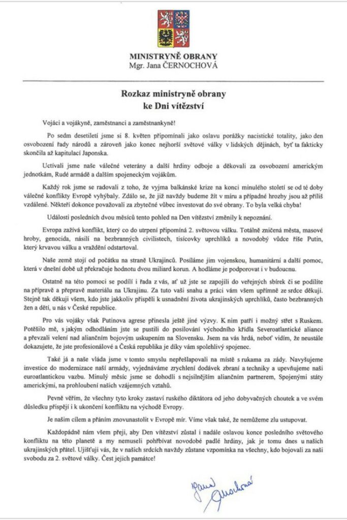 Na sociálních sítích koluje interní oběžník Ministerstva obrany Jany Černochové s názvem Rozkaz ministryně obrany ke Dni vítězství. (Foto: Twitter)