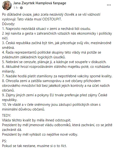 Právnička Hamplová vyzvala k demisi vlády. Uvedla 10 důvodů