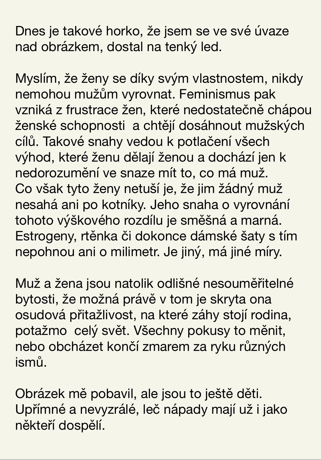 Včera mě za tento text zablokovali Fb. Už se asi nesmí mluvit o rozdílu pohlaví a přitom to je to jediné, co nás spojuje. Jakási komunita mimozemšťanů nám určuje jiná pravidla pro život na Zeměkouli.