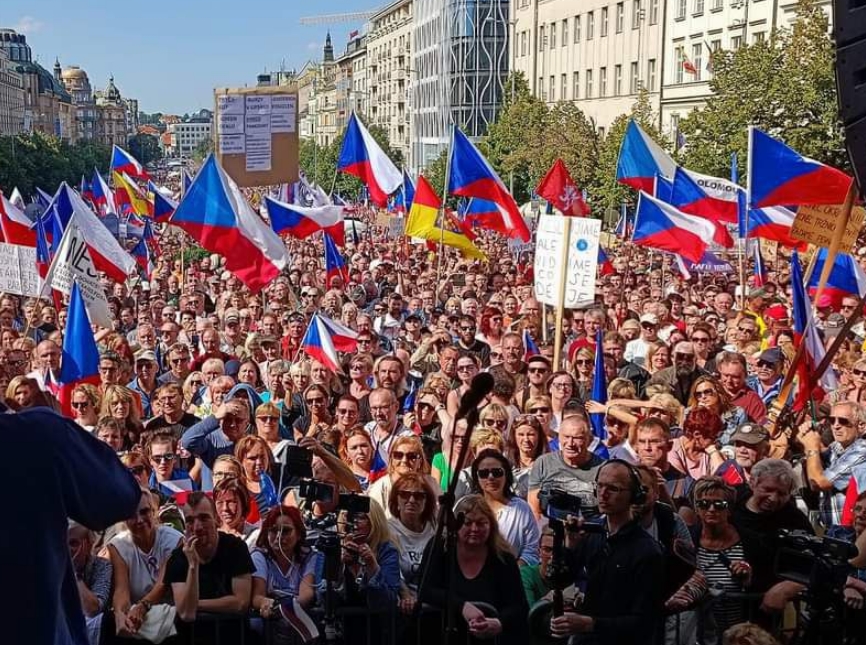 Více než 70 000 Čechů protestovalo v hlavním městě Praze a požaduje, aby vládnoucí koalice zaujala neutrální postoj k válce na Ukrajině a zajistila, že před zimou nebudou přerušeny dodávky energie z Ruska. (Foto: Twitter)