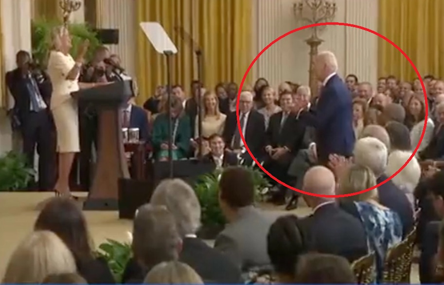 Joe Biden se ve středu dopustil dalšího přehmatu poté, co ho jeho manželka Jill okřikla, že jako jediný zůstal sedět během potlesku vestoje před jejím projevem. (Foto: Twitter)