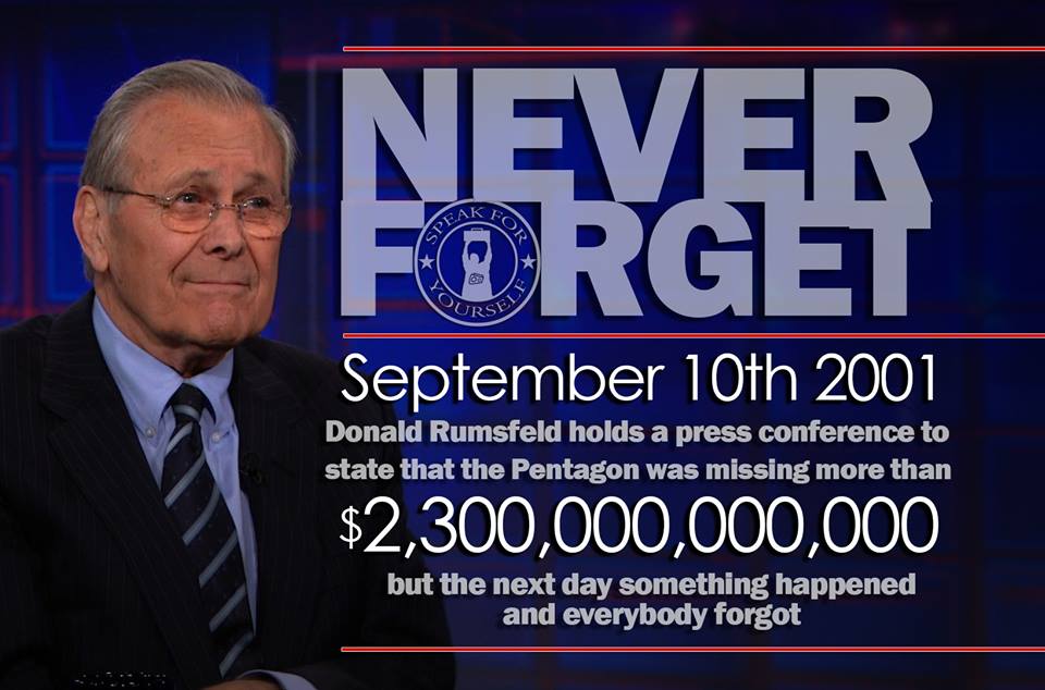 10. září 2001 ministr obrany Donald Rumsfeld oznámil, že Pentagon nedokáže zaúčtovat transakce v hodnotě 2,3 bilionu dolarů. (Foto: Flickr)Následující den se na to navždy zapomnělo. "Šťastné" načasování.