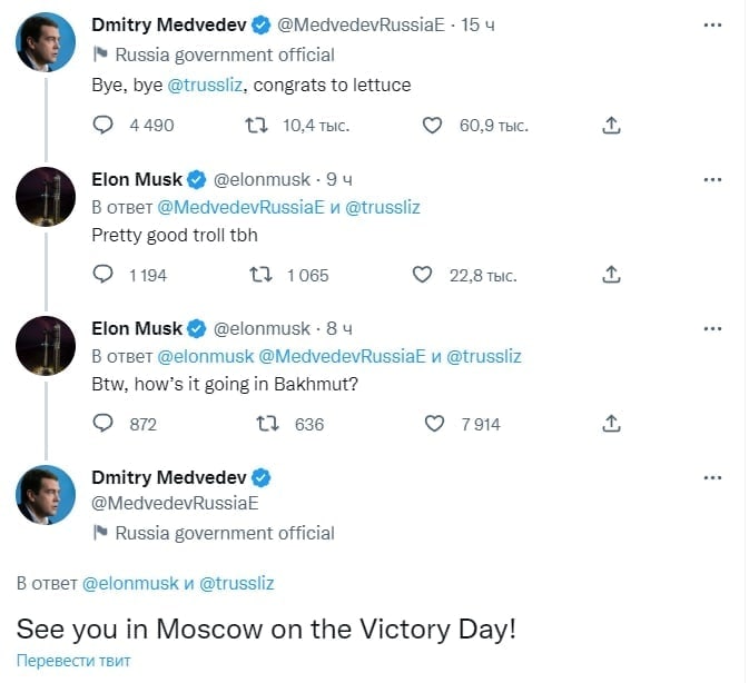 Místopředseda ruské bezpečnostní rady Dmitrij Medveděv pozval v pátek šéfa společnosti Elona Muska, aby se zúčastnil příští přehlídky ke Dni vítězství v Moskvě, která se bude konat 9. května 2023. (Foto: Flickr)Bye, bye, gratulace salátu. Docela dobrý troll tbhBtw, jak to jde v Bakhmutu? Uvidíme se v Moskvě na Den vítězství!Zdroj: breakingthenews.net