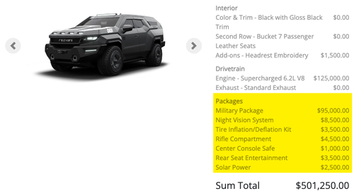 Cena osobního bezpečnostního vozidla začíná na 249 000 dolarech, ale jakmile se k němu přidá vojenský balíček (pancéřování), systémy nočního vidění, prostor pro pušky, sada pro huštění a vypouštění pneumatik a masivní přeplňovaný motor V8 – cena se vyšplhá na půl milionu dolarů.