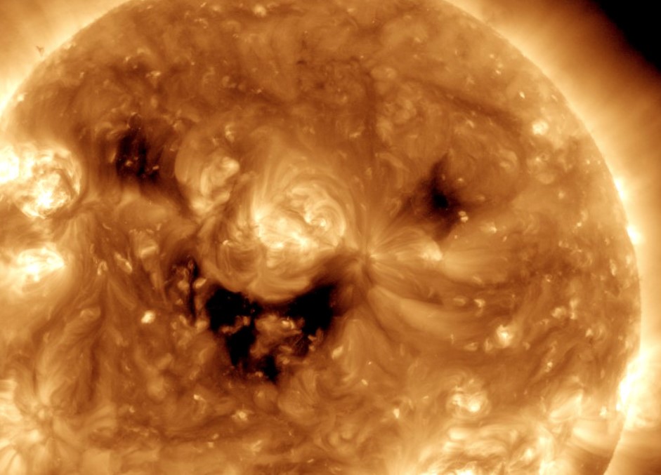 „Při pohledu v ultrafialovém světle jsou tyto tmavé skvrny na Slunci známé jako koronální díry a jsou to oblasti, kde rychlý sluneční vítr tryská do vesmíru,“ uvedla NASA a dodala, že Slunce vypadá, že se „usmívá“.
