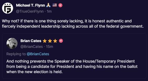 Pokud bude Trump zvolen předsedou Sněmovny… a pak budou nějakým tajemným čarodějnickým činem Biden i Harrisová zbaveni funkce za vysoké zločiny a přestupky, dokud se nebudou moci konat nové volby… předseda Sněmovny nastoupí do prezidentského úřadu.“