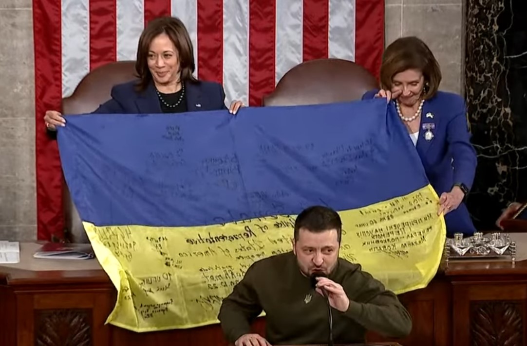 Ujistil, že Ukrajina vítězí „navzdory všem překážkám“. Po celou dobu byl často přerušován potleskem vestoje od částečně zaplněného Kongresu, v němž chybělo mnoho republikánů, částečně vzhledem k tomu, že řada zákonodárců již před nečekanou osobní návštěvou odcestovala domů na svátky a čelila přicházejícímu nepříznivému počasí.