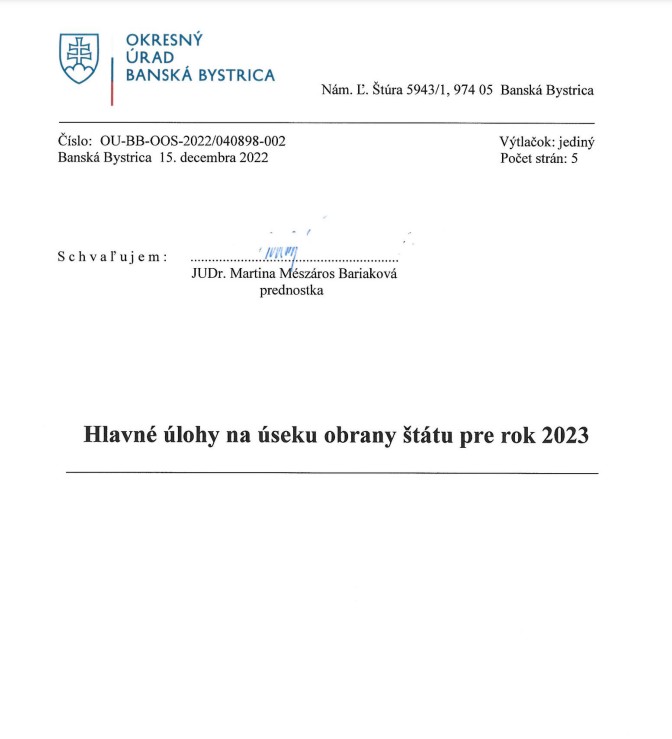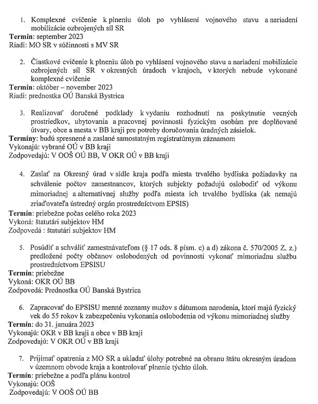 První bod se nazývá „Komplexní cvičení k plnění úkolů po vyhlášení válečného stavu a nařízení mobilizace ozbrojených sil Slovenské republiky“. Termín cvičení je stanoven na září 2023 a stát chce připravit svůj personál, aby věděl, co dělat v případě války.