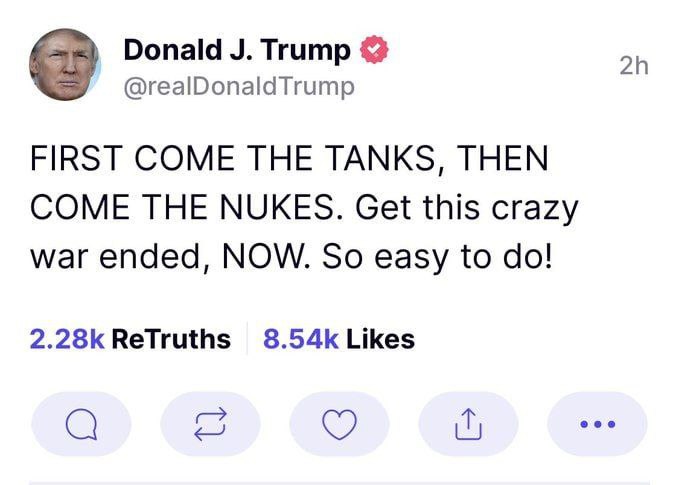 „NEJDŘÍV PŘIJDOU TANKY, PAK ATOMOVKY. Ukončete tuhle šílenou válku, TEĎ,“ napsal Trump na sociální síti Truth Social.