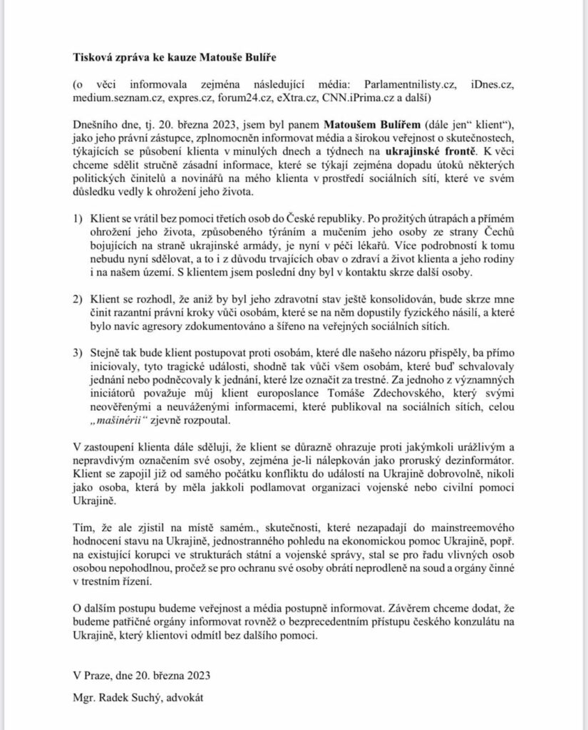 Advokát Radek Suchý vystavil tiskovou zprávu ke kauze Matouše Bulíře, který působil na Ukrajině, kde měl být mučen a ohrožen na životě. (Foto: Twitter)Tak tento Lynč obhajuje to evropské 💩@TomasZdechovsky pic.twitter.com/r5KMiaXfez— Marco (@marc_kebo) March 17, 2023 „Po zhlédnutí více jeho videí jsem seznal, že je to jen šiřitel zavádějících informací, stačí si ta videa prohlédnout. …