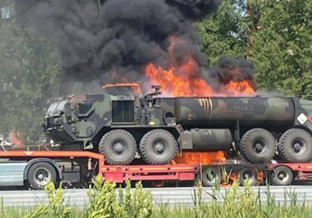 V Salaspilsu (18 km od Rigy) byl zapálen vojenský kamion s pohonnými hmotami, který byl převážen v návěsu nákladního automobilu. (Foto: Twitter)Očití svědci hlásí dva Zástupce ozbrojených sil země uvedl, že zapálená vojenská technika se přesouvala přes Lotyšsko do Litvy. Kamion s pohonnými hmotami byl ve Finsku na vojenském cvičení.🇱🇻Unknown people set fire to NATO …