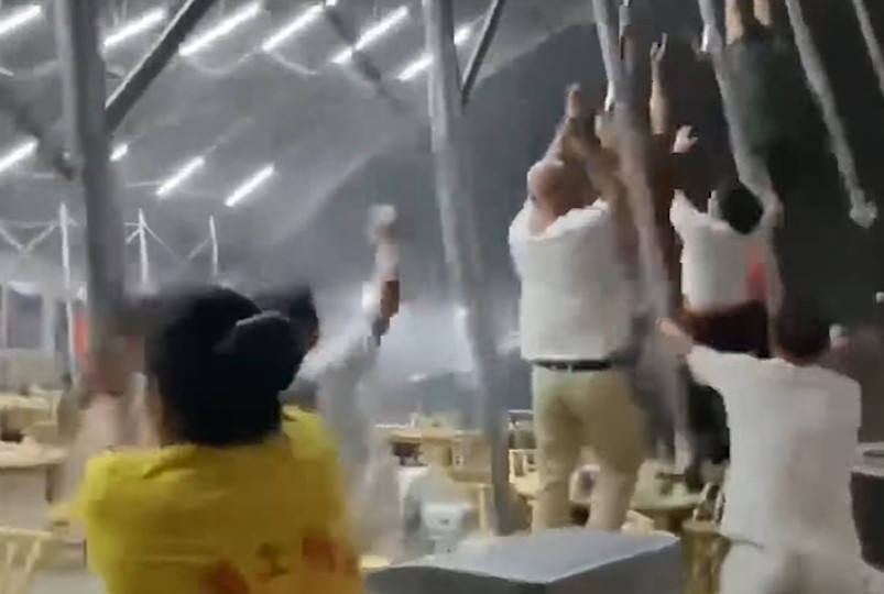 Video z incidentu, které bylo tento týden zveřejněno v aplikaci pro sdílení videí Douyin, ukazuje, jak silný vítr smetl kryt stříšky i s několika muži, kteří drželi kovové vzpěry venkovního přístřešku.