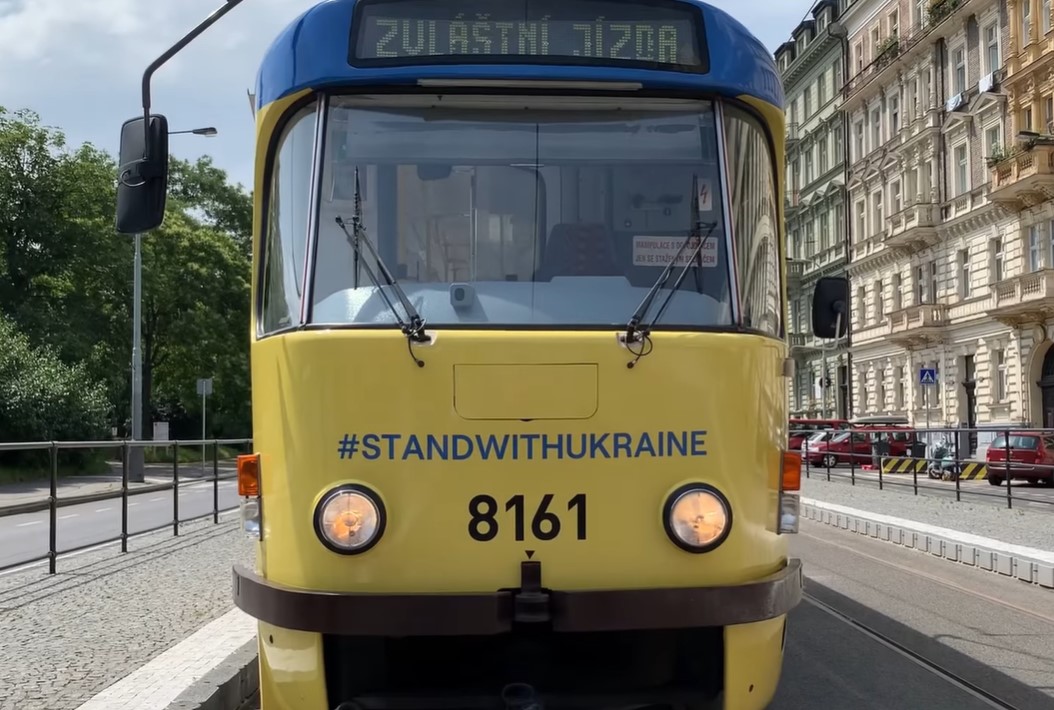 Křest tramvaje v národních barvách Ukrajiny, která poprvé vyjede dnes na lince 22 a bude v Praze jezdit minimálně půl roku. (Foto: Twitter)