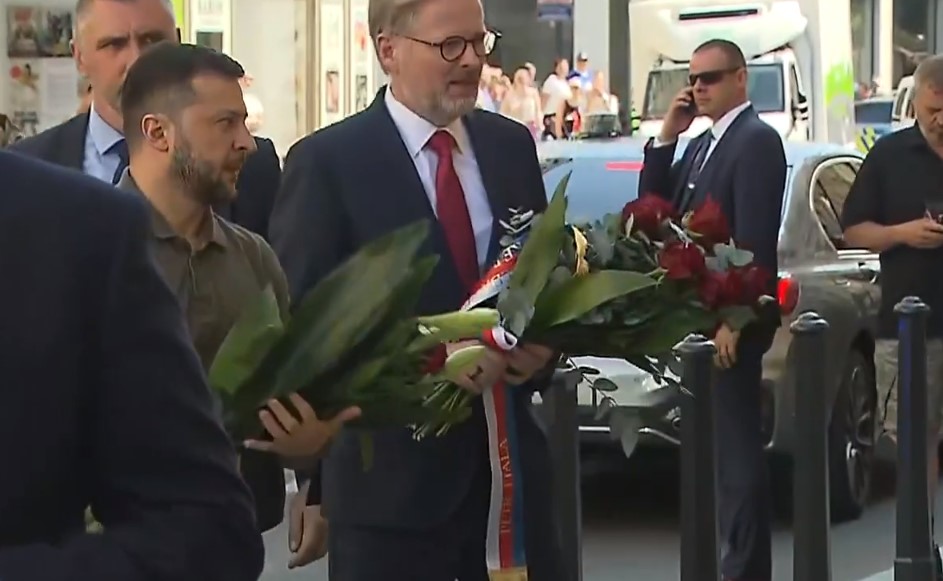 Ukrajinský prezident Volodymyr Zelenskyj se v rámci své návštěvy Prahy společně s premiérem Fialou poklonil u pamětní desky 17. listopadu na Národní třídě.