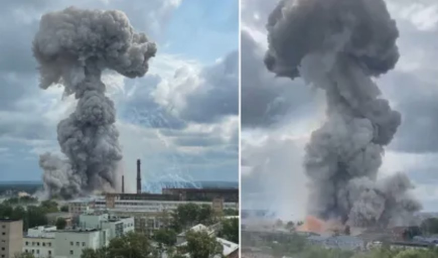 V ruské továrně severovýchodně od Moskvy došlo ve středu k mohutnému výbuchu neznámé příčiny, který zranil nejméně 45 lidí a poškodil okolní budovy. Někteří z nich jsou ve vážném stavu. (Foto: Twitter)