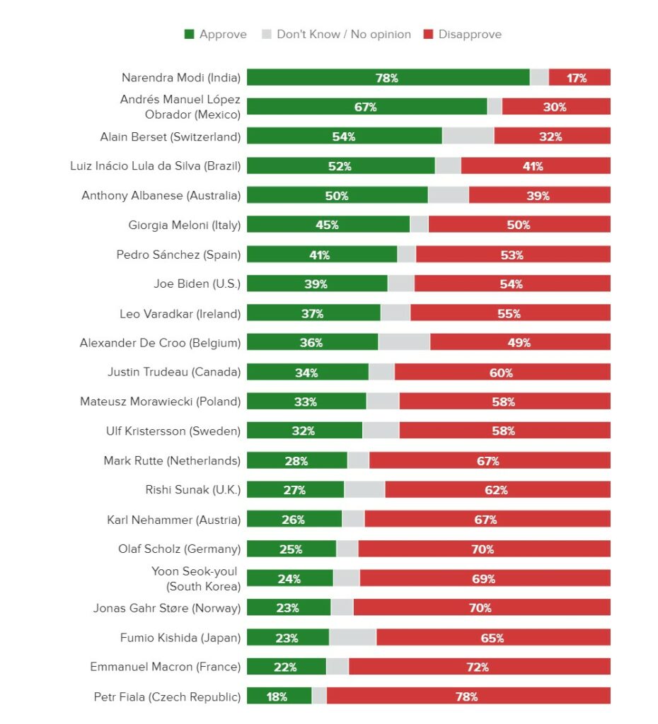 Nejnovější hodnocení vychází z údajů shromážděných od 27. září do 3. října 2023. (Foto: Youtube)Hodnocení schvalování vychází ze sedmidenního klouzavého průměru dospělých obyvatel v každé zemi, přičemž velikost vzorku se v jednotlivých zemích liší.Morning Consult Political Intelligence v současné době sleduje hodnocení vládních představitelů v Austrálii, Rakousku, Belgii, Brazílii, Kanadě, České republice, Francii, Německu, Indii, …
