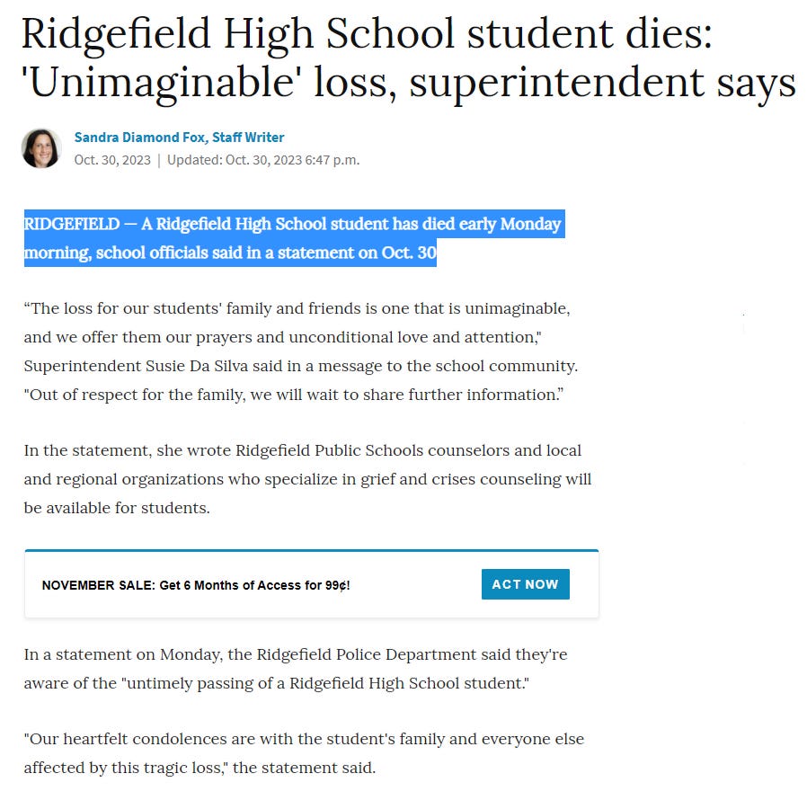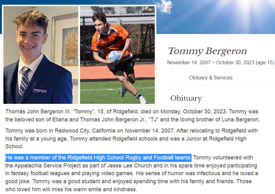 30. října 2023 – Ridgefield, CT – 30. října 2023 brzy ráno zemřel student střední školy v Ridgefieldu. Patnáctiletý Tommy Bergeron byl členem ragbyového a fotbalového týmu střední školy v Ridgefieldu.