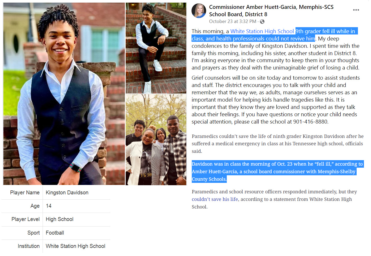23. října 2023 – Memphis, TN – 14letý Kingston Davidson byl ve třídě, když se mu udělalo „špatně“, zastavilo se mu srdce a náhle zemřel.