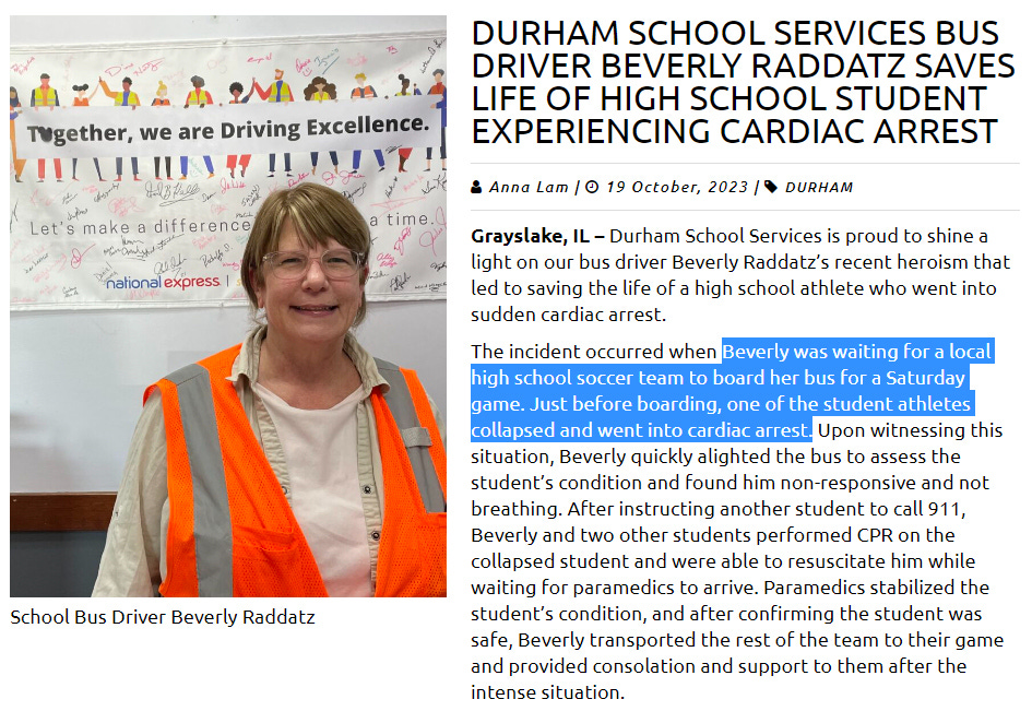 14. října 2023 – Grayslake, IL – Řidička školního autobusu Beverly Raddatzová čekala na místní středoškolský fotbalový tým, který měl nastoupit na sobotní zápas. Těsně před nástupem jeden ze studentů sportovců zkolaboval a došlo u něj k zástavě srdce.