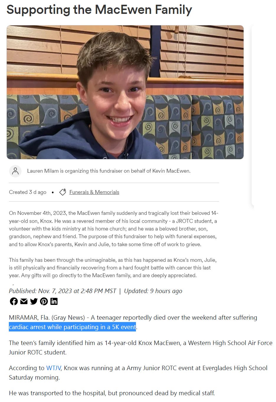 listopadu 2023 (horní foto) - Davie, FL - Čtrnáctiletý Knox MacEwen je studentem výcvikového sboru mladých důstojníků v záloze (ROTC) na střední škole Western High School Air Force. Dne 4. listopadu běžel na cvičení armádního Junior ROTC, když během běhu na 5 km dostal zástavu srdce a v nemocnici zemřel. Jeho matka se zotavuje z …
