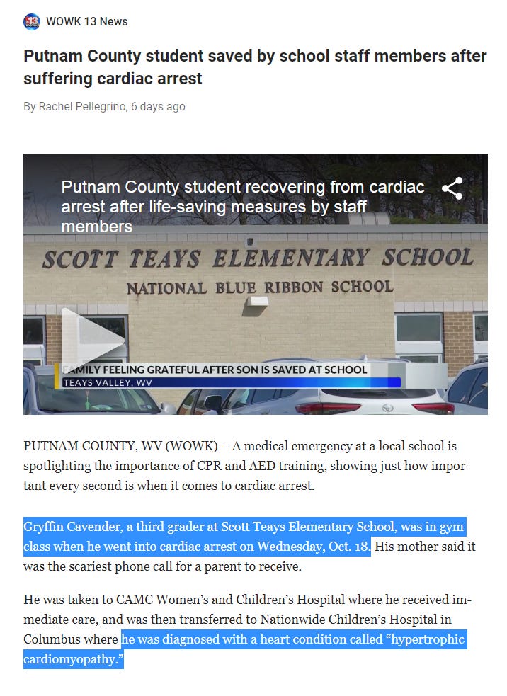 18. října 2023 – Putnam County, WV – devítiletý Gryffin Cavender, žák třetí třídy základní školy Scotta Teayse, byl v hodině tělesné výchovy, když u něj 18. října 2023 došlo k zástavě srdce.