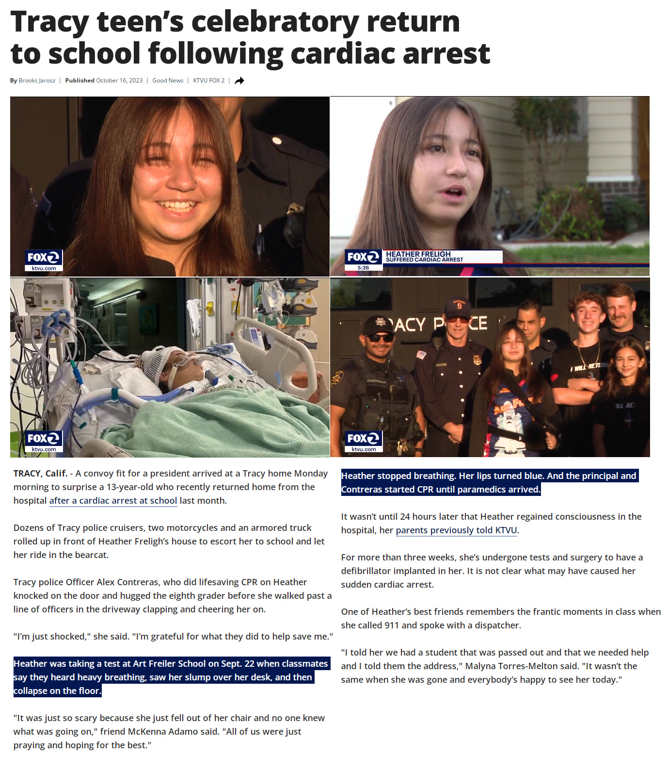 22. září 2023 – Tracy, Kalifornie – 13letá Heather Frelighová psala test, když se zhroutila nad stolem a padla na podlahu se zástavou srdce.