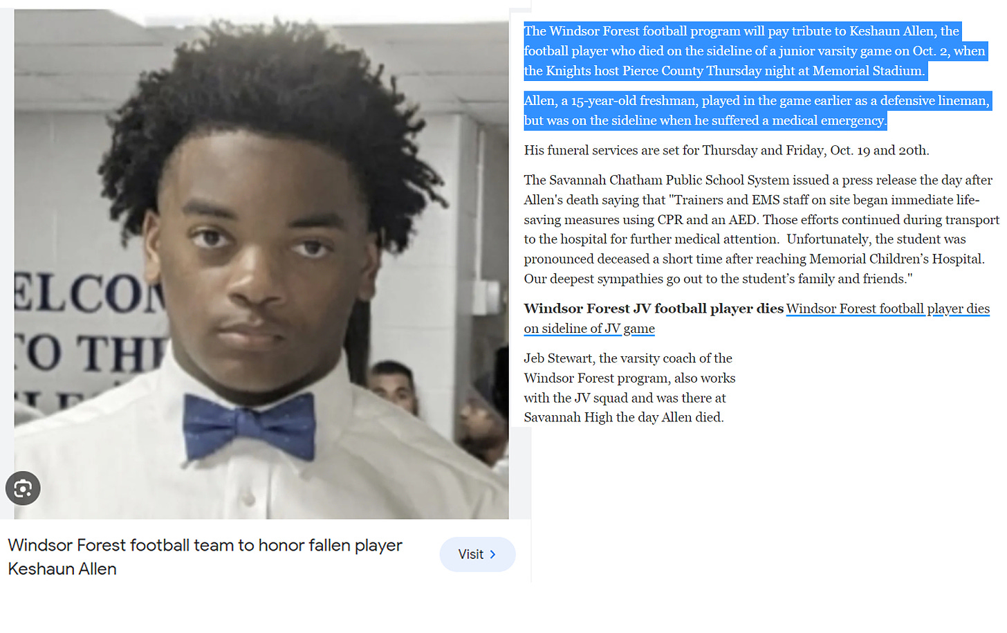 2. října 2023 – Savannah, GA – 15letý Keshaun Allen utrpěl během fotbalového zápasu zdravotní potíže a 2. října 2023 náhle zemřel.