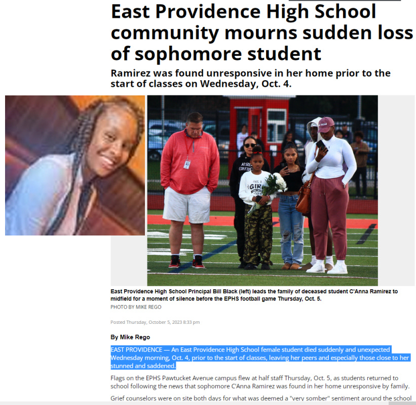 4. října 2023 – Ráno 4. října 2023 náhle zemřela ve spánku před začátkem vyučování patnáctiletá C’Anna Ramirezová, studentka střední školy v East Providence.