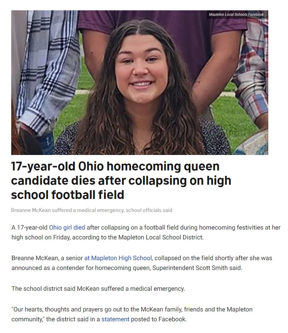 29. září 2023 – Ohio – sedmnáctiletá Breanne McKeanová náhle zemřela během slavnostního plesu. 29. září 2023 „poté, co zkolabovala na fotbalovém hřišti střední školy v Mapletonu kvůli zdravotním potížím, kde byla součástí plesového dvora“.