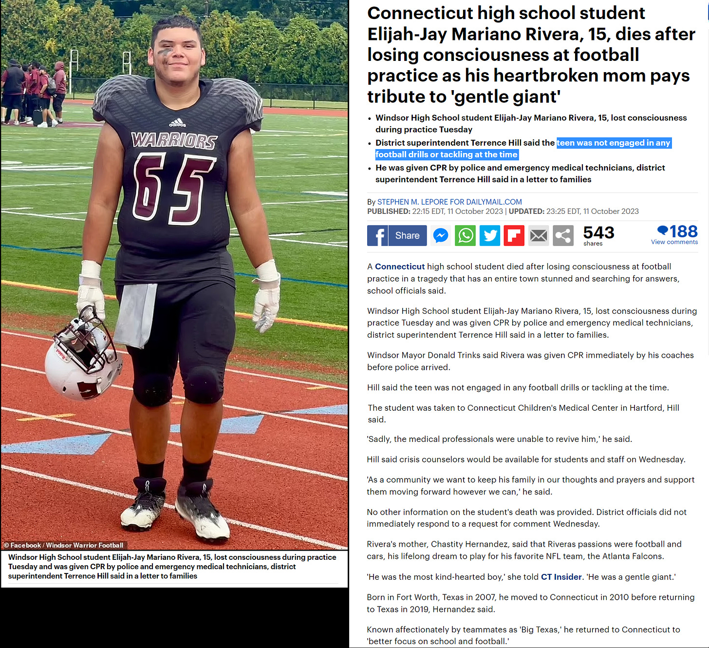 10. října 2023 – CT – 15letý Elijah-Jay Mariano Rivera ztratil během fotbalového tréninku vědomí a 10. října 2023 náhle zemřel.