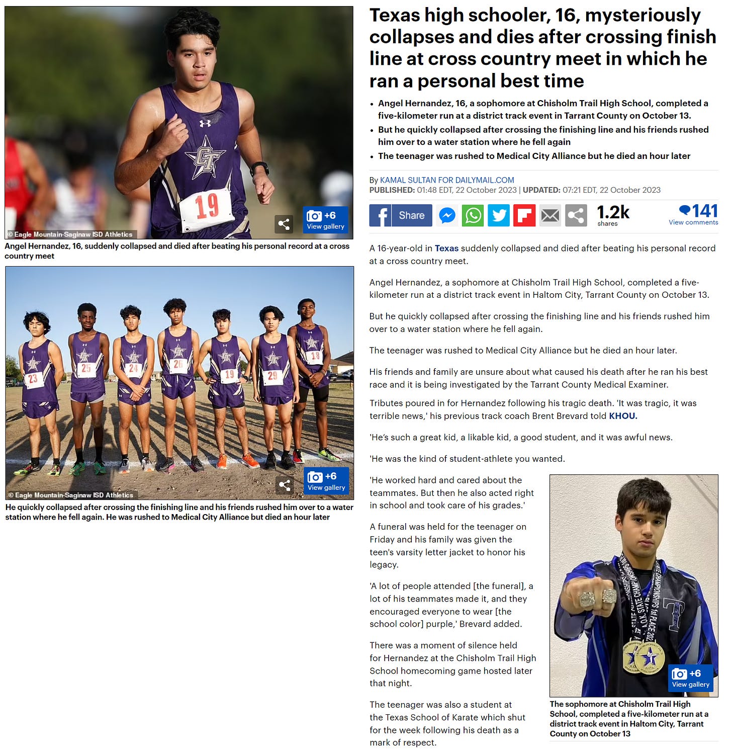 13. října 2023 – Šestnáctiletý Angel Hernandez, student druhého ročníku střední školy Chisholm Trail High School, dokončil 13. října běh na 5 km na okresní atletické soutěži v Tarrant County, ale po protnutí cílové čáry rychle zkolaboval a o hodinu později zemřel.