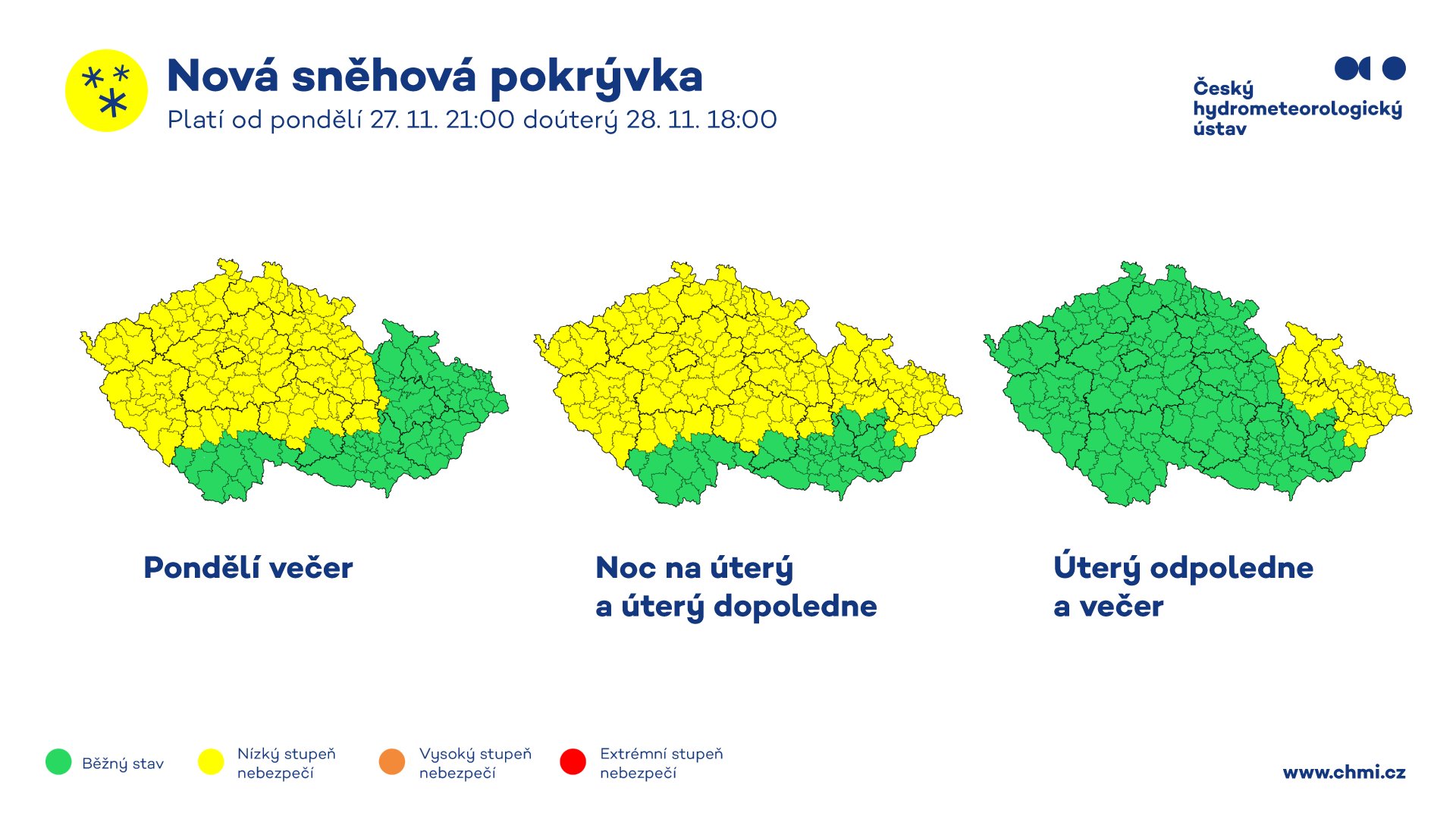 Během úterý odpoledne a večera se nad 600 m nad mořem mohou místy tvořit sněhové jazyky, na horách i závěje. V úterý později odpoledne a večer se při poklesu teplot pod bod mrazu budou vytvářet zmrazky nebo i náledí.