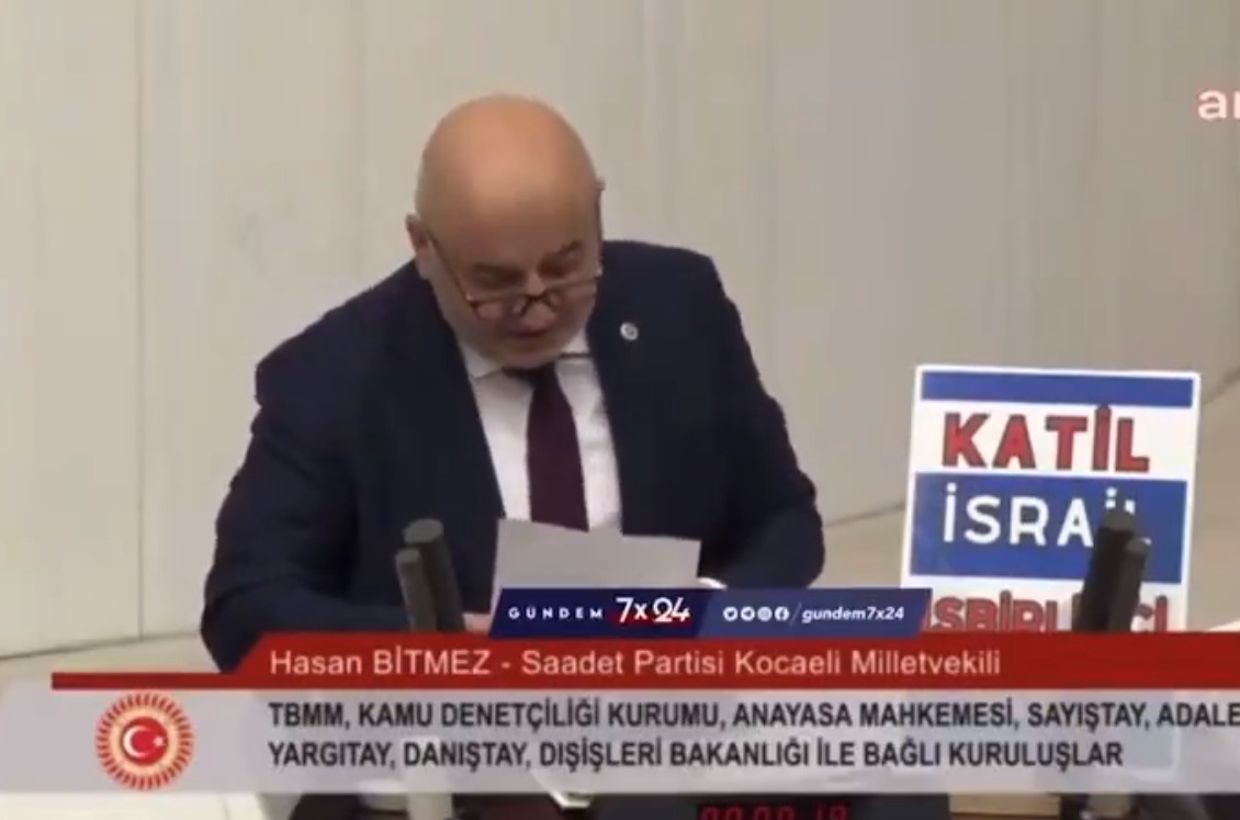 Drama v tureckém parlamentu. Poslanec Hasan Bismet ostře vystoupil proti Izraeli a vykřikoval, že Izraelci trpí „Alláhovým hněvem“. O několik vteřin později dostal infarkt. (Foto: X)