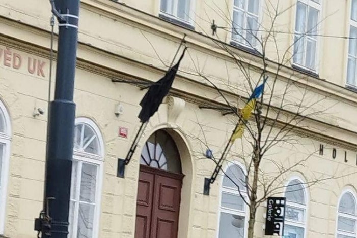 “Je-li na budově jen jeden držák, vyvěsí se místo státní vlajky černý prapor. Jsou-li na budově DVA držáky, vyvěsí se státní vlajka NALEVO při čelním pohledu na budovu a černý prapor NAPRAVO….” (Citace z webu MV ČR).
