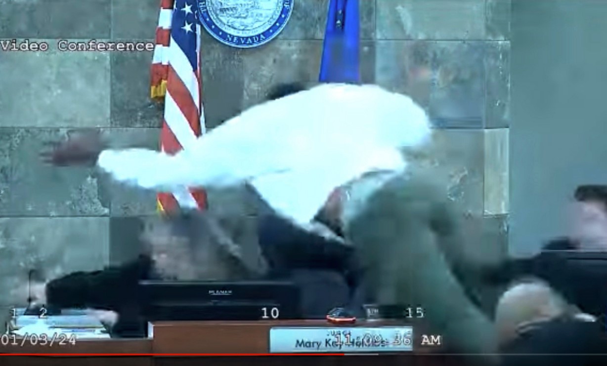 USA - 30letý Theobra Delona Reddena, srazilo na zem za soudcovskou lavicí několik soudních a vězeňských úředníků a zaměstnanců soudu poté, co napadl soudkyni. (Foto: X)Muž byl zatčen a umístěn do vazební věznice Clark County Detention Centre, kde čelí několika novým obviněním z trestných činů, včetně ublížení na zdraví chráněné osobě s odkazem na soudce …