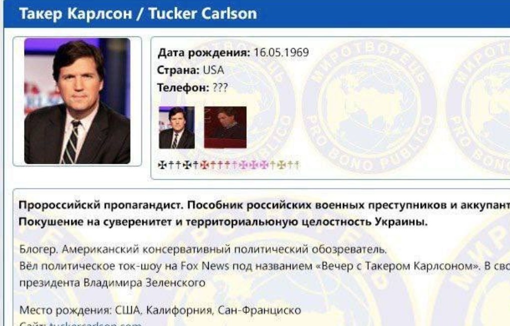 🚨🇺🇦🇺🇸 Tucker Carlson has been placed on the Ukrainian Government’s Myrotvorets KILL LIST. pic.twitter.com/y0uwupBve1