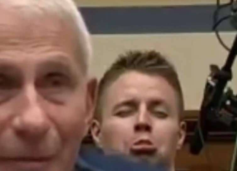 USA – „Smějící se muž“ za Faucim se stal virálně slavným poté, co používal různé grimasy při výpovědi imunologa Fauciho. (Foto: X)