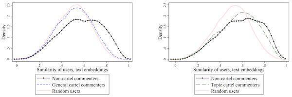 Obrázek níže ilustruje tyto efekty na základě nezpracovaných dat (regresní odhady, kontroly robustnosti a další analýzy viz článek). Zobrazuje rozdělení kosinové podobnosti mezi autorem a komentátorem, a to zvlášť pro obecné (levý panel) a tematické (pravý panel) kartely. Ukazuje, že komentátoři, kteří nejsou členy kartelu (přirozená angažovanost), mají nejvyšší podobnost s autorem obsahu a náhodní uživatelé nejnižší. Kvalita shody z obecných kartelů je podobná náhodnému zapojení (levý panel). Naproti tomu zapojení tematických kartelů je mnohem bližší přirozenému zapojení (pravý panel).