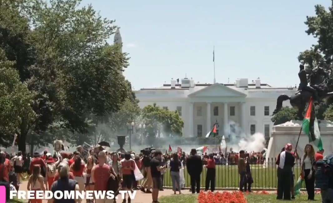 Při protestech za Palestinu zapalují dýmovnice a světlice a plánují obklíčit Bílý dům. Policie nasadila do okolních davů slzný plyn a posádky postavily kolem Bílého domu velký protiuprchlický plot v očekávání víkendového protestu proti Gaze.