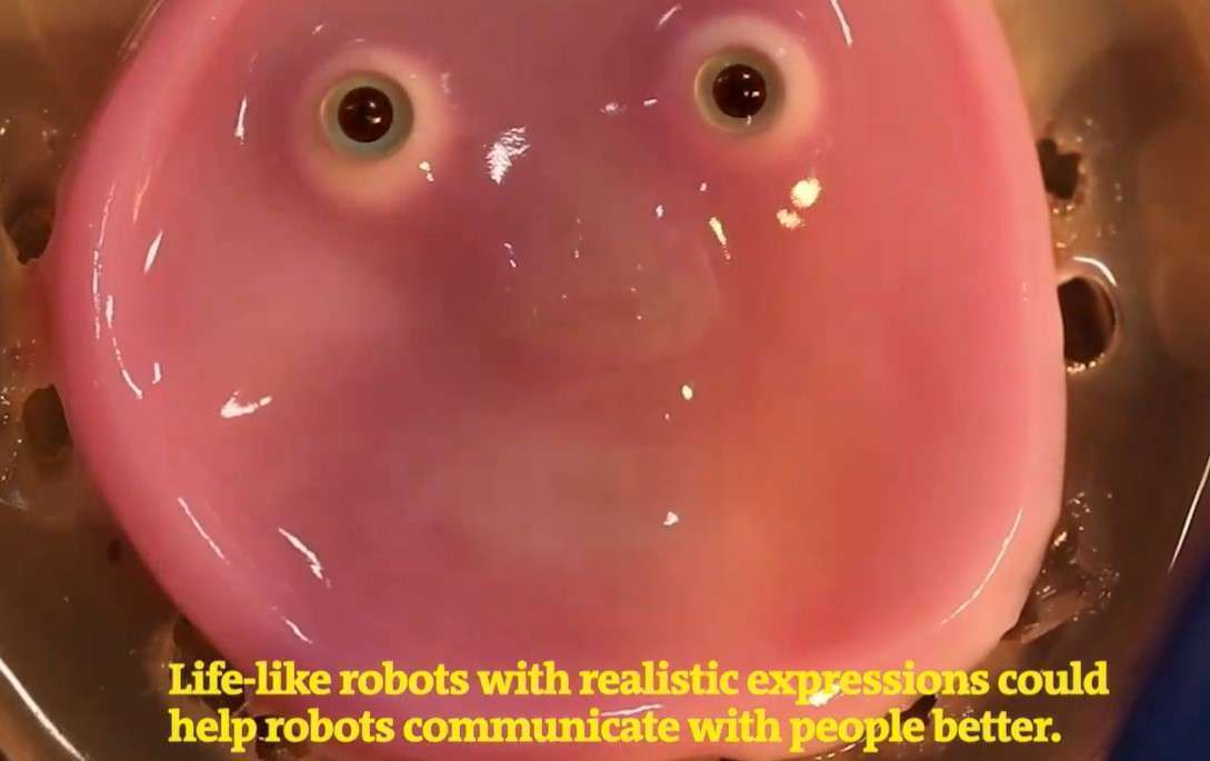 Video ukazuje, jak kůže připevněná k prototypu robota donutí růžovou neživou skvrnu s očima, aby se náhle rozzářila úsměvem.