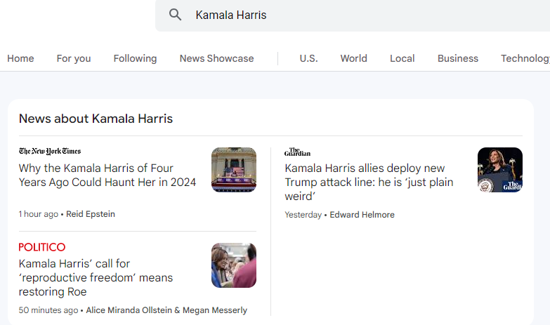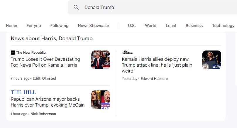 Vyhledal jsem na Google News „Donald Trump“. Google News to změnil na „Harrisová, Donald Trump“ a pokračoval v zobrazování pouze zpráv, které upřednostňují Harrisovou před Donaldem Trumpem.